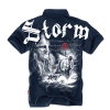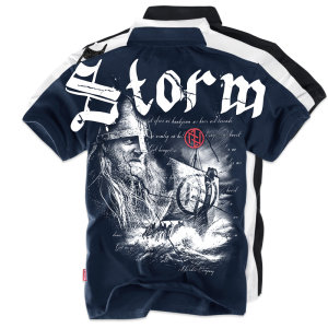 Vysoko kvalitná polokošeľa s krátkym rukávom. Golierik na zapínanie na tri gombíky, vo vnútri lemovanie v kontrastnej farbe, rukáv zakončený sťahovacím lemom. Na boku červená firemná ceduľka. Na ľavej strane hrudi neveľký štít. Rovnaký prvok zopakovaný na zadnej strane, uprostred vzoru s postavou Vikinga a drakarom na mori. Na lopatkách nápis Storm. Použité písmo v gotickom štýle a takisto efekt popraskania potlače.