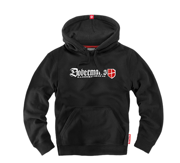 Pánska mikina typu klokanka. Na hrudi jednofarebná potlač s názvom kolekcie a označením D.A Combat Gear 44 a trojfarebná vyšívaná nášivka v podobe štítu s krížom v škandinávskom štýle. Na zadnej strane veľké logo Doberman's vytlačené zvisle pozdĺž chrbta. Mikina vyrobená zo stopercentnej bavlny o hmotnosti 320g. Motel typu klokanka. Má kapucňu so šnúrkami a široké sťahovacie lemy. Na kapucni a naboku mikiny viditeľné červené štítky s logom značky.