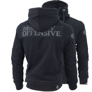 A hoodie fastened high up to the neck with drawstrings at the hood, and metal eyelets with the Dobermans logo. It has pockets on the sides. The sleeves and the bottom are finished with wide, durable welts. Inside, there is a company label, and there is a badge with the Offensive emblem on the right sleeve. On the back of the hoodie, there’s a black cotton fabric with the print Dobermans Offensive. The print is made entirely in 3D technology. In the lower left part of the hoodie, there’s a tag with the company logo at the welt. The hood is large and protects the lower part of the face when the zipper is fastened completely. The hoodie is made of 100% cotton that weighs 300 g.