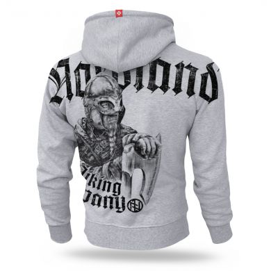 Pánska mikina na zips s vysokým golierom, ktorý prechádza do kapucne. Vyrobená zo stopercentnej bavlny a zakončená širokými sťahovacími lemami. Na prednej strane dve našité vrecká a neveľká, zvislá potlač Nordland, ktorá sa nachádza pozdĺž švu. Pri kapucni šnúrky s kovovými zakončeniami a štítok označený znamením značky Doberman's. Zadná strana mikiny je ozdobená vzorom s efektom predrenia. Vzor zaberá takmer celý povrch výrobku a zobrazuje Vikinga opretého o sekeru. Nižšie heslo Viking Company, guľatý štít s runovými znakmi a dátum 793, na lopatkách nápis Nordland, ktorý prechádza cez švy rukávov. Použité písmo v gotickom štýle.