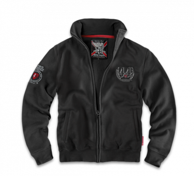 Klasická pánska mikina na zips. Model na zapínanie vysoko pri krku a zakončený elastickými sťahovacími lemami. Na lopatkách jednofarebný vzor s vavrínovým vencom okolo symbolu 44 a nápisu Doberman's Combat Gear v gotickom štýle. Na ľavej strane hrudi zopakovaný motív venca, s pridaným neveľkým červeným štítom. Pravý rukáv ozdobený jednofarebnou výšivkou zhotovenou priamo na látke. Uprostred vyšívania farebná nášivka v podobe štítu s číslom 44. Mikina je vyrobená zo stopercentnej bavlny o vysokej hmotnosti (320g).