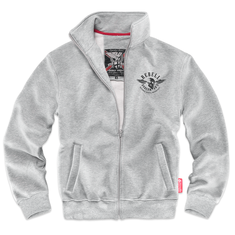 Mikina s potlačou v motorkárskom štýle, zobrazujúcá lebku s krídlami. Okolo blesky a dvojfarebný nápis Rebell Doberman's. Vzor s efektom popraskania zaberá značný povrch chrbta. Predná strana ozdobená neveľkým logom s rovnakým motívom. Jednoduchá pánska mikina klasického strihu, na zapínanie vysoko pri krku a zakončená odolnými sťahovacími lemami. Vo vnútri červené plisovanie a farebná ceduľka so symbolom orla, na boku značkový štítok. Výrobok zo 100% bavlny o vysokej hmotnosti (200g).