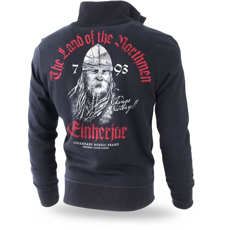 Pánska mikina na zips so zvýšeným golierom. Na prednej strane sú dve vrecká. Oblečenie je vyrobené z vysoko kvalitnej bavlny s hmotnosťou 320g. Na ľavom rukáve je menšia nášivka s logom Dobermans Aggressive. Na ľavej prednej strane je nápis s heslom Viking Victory. Zadná strana mikiny je pokrytá veľkou postavou Vikinga v zbroji. Vyššie je gotický nápis The Land of the Northmen.