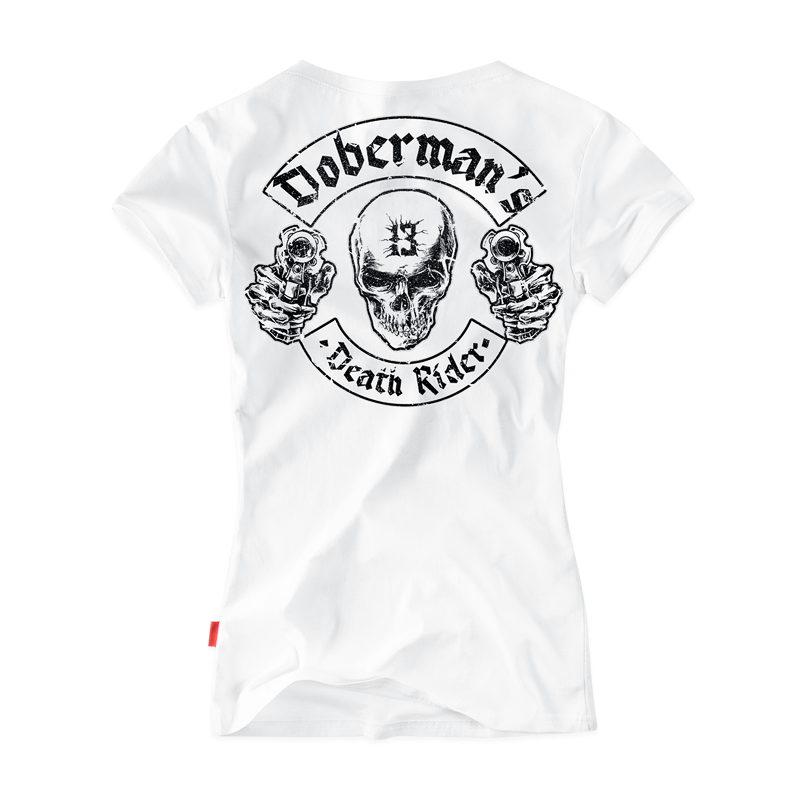 Bavlnené, vypasované dámske tričko s krátkym rukávom a guľatým výstrihom. Pri krku sťahovací lem a vnútorné lemovanie v červenej farbe. Na boku firemná ceduľka. Vzor z kolekcie Death Rider: veľký vzor s lebkou, dvoma pištoľami a logom Doberman's Death Rider napísaným na prápory. Na prednej strane neveľké logo s motívom pištole. Jednofarebná potlač s viditeľným efektom popraskania.