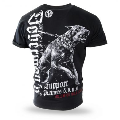 Pánske tričko s potlačou je vyrobené z vysoko kvalitnej bavlny s hmotnosťou 200g. Klasický strih s krátkym rukávom, na rukáve je malá nášivka s logom značky. Potlač pokrýva takmer celú zadnú stranu trička, uprostred sa nachádza pes pripravený k útoku. Na boku je nápis Dobermans a ďalšie heslá s gotickým písmom. Na ľavej prednej strane trička je malý nápis.
