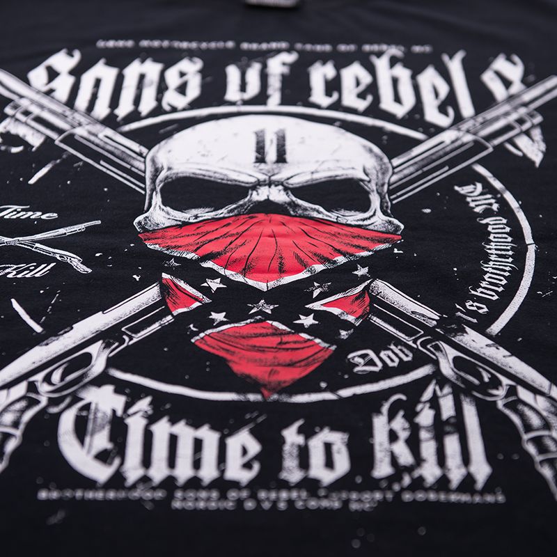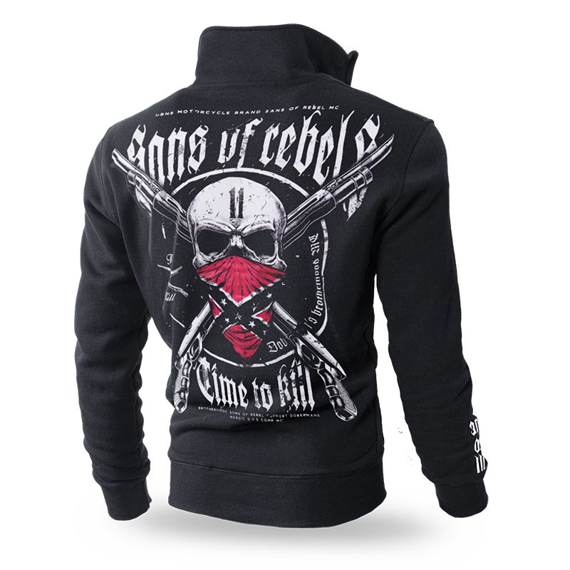 Pri krku, rukávov a v dolnej časti mikiny sú odolné sťahovacie lemy. Na hrudi sú skrížené brokovnice, na rukáve logo značky a heslo „Time to Kill”. Na zadnej strane je veľkoformátový vzor v motorkárskom štýle. Medzi heslami Sons of Rebel a Time to Kill sa nachádza lebka zakrytá konfederačnou šatkou, v pozadí sú dve skrížené brokovnice.