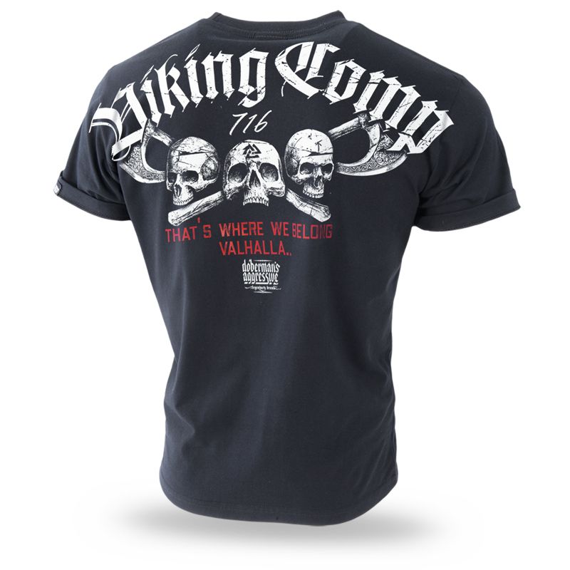 Klasické pánske tričko s krátkym rukávom. Na ľavom rukáve je malá ceduľka s logom značky. Vpredu a vzadu potlač Viking Comp - „That’s where we belong Valhalla”.