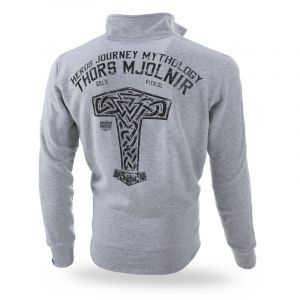 Mikina so sťahovacími lemami s dvomi vreckami na prednej strane. Na chrbte je potlač, ktorá zobrazuje Thorovo kladivo s nápisom HEROS JOURNEY MYTHOLOGY THORS MJOLNIR a logo Doberman's Aggressive. Na ľavej prednej strane hrudi je miniatúra vzoru Thorovho kladiva.