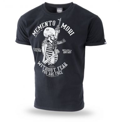 Klasické pánske tričko s krátkym rukávom. Na ľavom rukáve je malá ceduľka s logom značky. Vpredu veľká potlač s jasným posolstvom: MEMENTO MORI WITHOUT FEAR YOU ARE FREE.