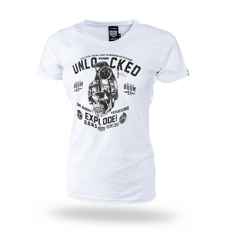 Dámske tričko v mierne vypasovanom strihu. Na ľavom rukáve je umiestnená malá ceduľka s logom značky. Vpredu a vzadu potlač "Unlocked explode!".