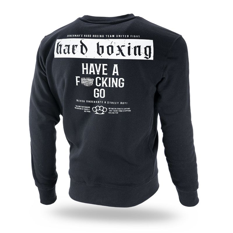 Klasická pánska mikina. Na ľavom rukáve je malá ceduľka s logom značky. Dolná časť mikiny a rukáve sú zakončená širokým sťahovacím lemom. Vpredu a vzadu potlač Hard Boxing.