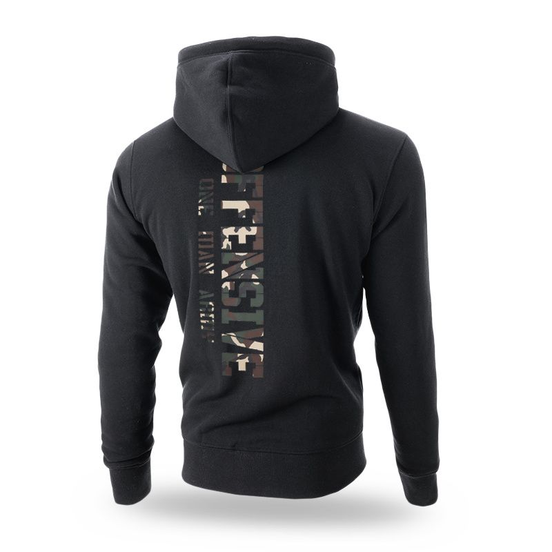 Mikina s kapucňou so zapínaním na zips. Mikina je vyrobená z vysoko kvalitnej bavlny, zakončená sťahovacími lemy a s dvoma vreckami na prednej strane. Na ľavom rukáve je malá ceduľka s logom značky. Kapucňa je ozdobená širokou šnúrkou a kovovými zakončeniami s logom značky. Po celej línii chrbta je veľká potlač "Offensive One Man Army".