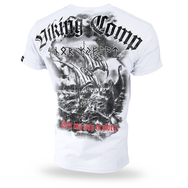 Pánske tričko zo 100% bavlny klasického strihu s krátkym rukávom. Na prednej ľavej strane hrudi je malý nápis Viking Comp doplnený runovými symbolmi. Zadná časť potlače vyobrazuje lode Vikingov na rozbúrenom mori s nápisom Viking Comp - On my way to glory.