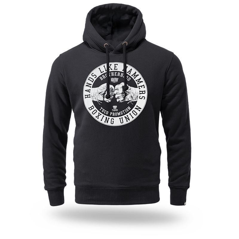 Mikina s kapucňou od Dobermans Aggressive je vyrobená z príjemnej, pohodlnej bavlny, zakončená širokými, elastickými sťahovacími lemami ako v páse, tak aj na rukávoch. Na hrudníku veľká potlač Hands like hammer, boxing union.