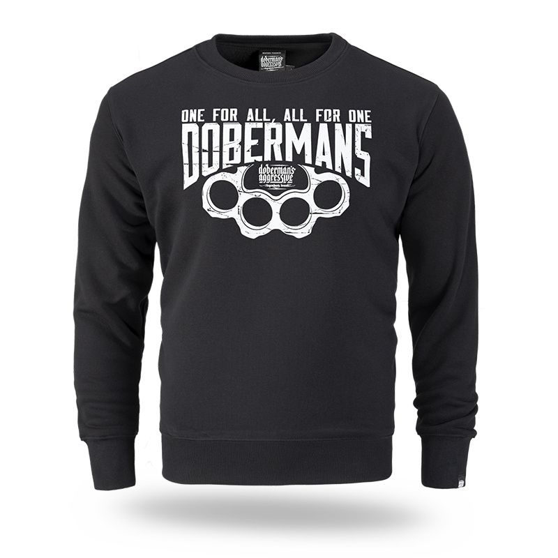 Pánska mikina obliekaná cez hlavu. Na ľavom rukáve je malá ceduľka s logom značky. Dolná časť mikiny a rukávov je zakončená širokým sťahovacím lemom. Na prednej strane mikiny je veľký nápis DOBERMANS s nápisom One For All, All For one. Celok je zakončený vzorom boxera a logom značky.