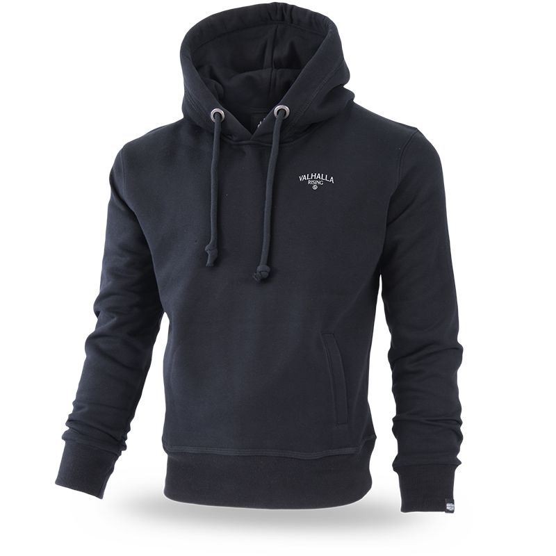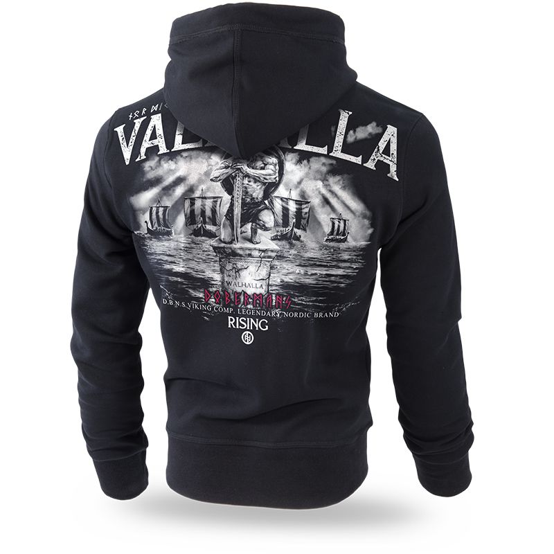 Klasická mikina klokanka s veľkým vreckom na prednej strane. Mikina je vyrobená z vysoko kvalitnej bavlny s hmotnosťou 320g. Pri krku, rukávov a v dolnej časti mikiny sú odolné sťahovacie lemy. Objemnú kapucňu je možné nastavovať šnúrkami s kovovými zakončeniami. Na ľavom rukáve je nášivka s logom Dobermans Aggressive. Na zadnej strane je viditeľný vzor s bojovníkom, ktorý kľačí na podstavci a opiera sa o meč. Za postavou je more a Drakkary. Medzi ramenami je veľký nápis Valhalla. Na prednej strane je menšia potlač s nápismi a rúnovým symbolom. Vzor nadväzuje na škandinávsku kultúru.