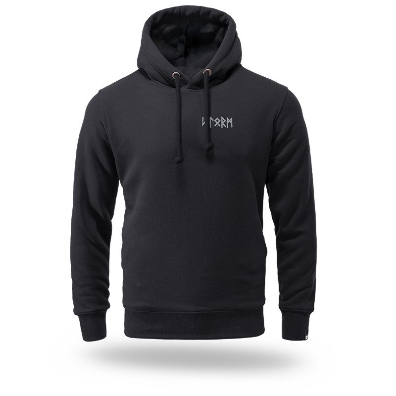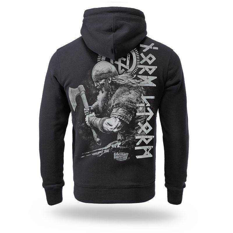 Mikina s kapucňou od Dobermans Aggressive je vyrobená z príjemnej, pohodlnej bavlny, zakončená širokými, elastickými sťahovacími lemami ako v páse, tak aj na rukávoch. Na dvojito prešitej kapucni je veľké logo Doberman's Aggresive. Na zadnej strane je veľká potlač bojovníka so sekerou a runovými symbolmi. Na prednej strane minimalistický potlač Storm.
