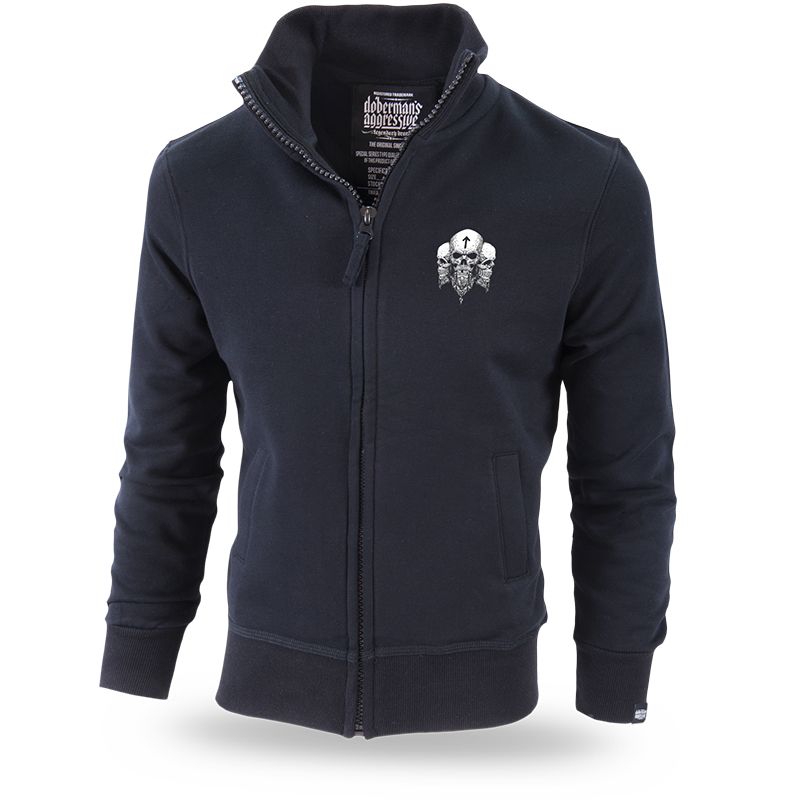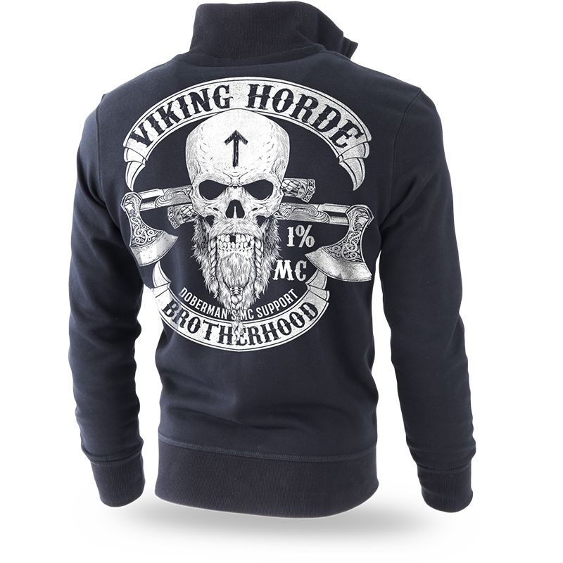 Klasická pánska mikina na zips, vyrobená z vysoko kvalitnej bavlny. Pri rukávov a v dolnej časti mikiny sú odolné sťahovacie lemy. Vo vnútri mikiny je malá nášivka s logom značky Dobermans Aggressive. Na prednej strane sú vyobrazené tri lebky. Zadnú časť mikiny pokrýva vzor, ktorý nadväzuje na severskú mytológiu. Uprostred sa nachádza lebka Vikinga so sekerami. Na stranách sú vlajky so sloganmi Viking Horde a Brotherhood. Model je z kolekcie Vikings.