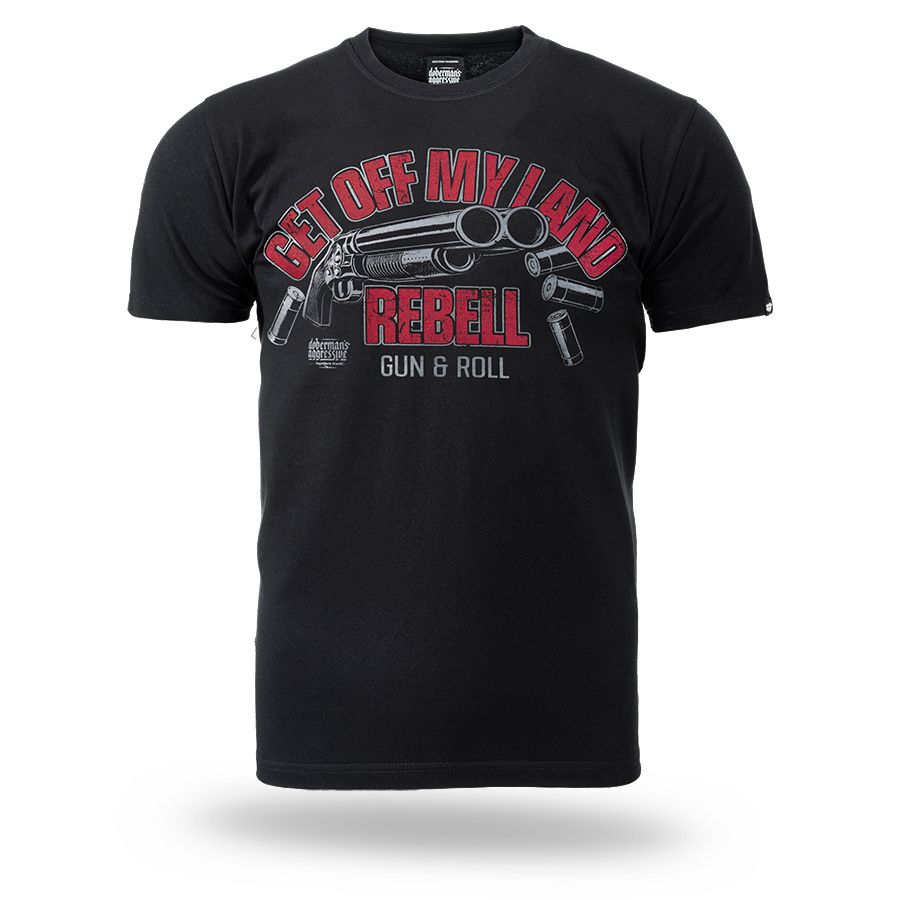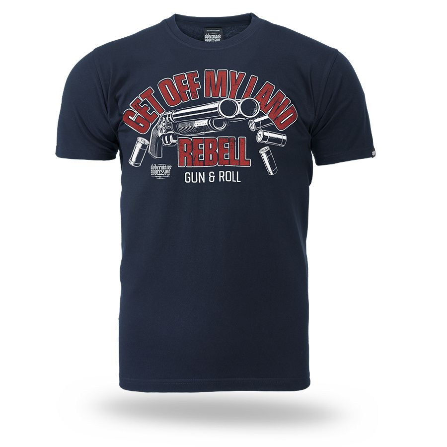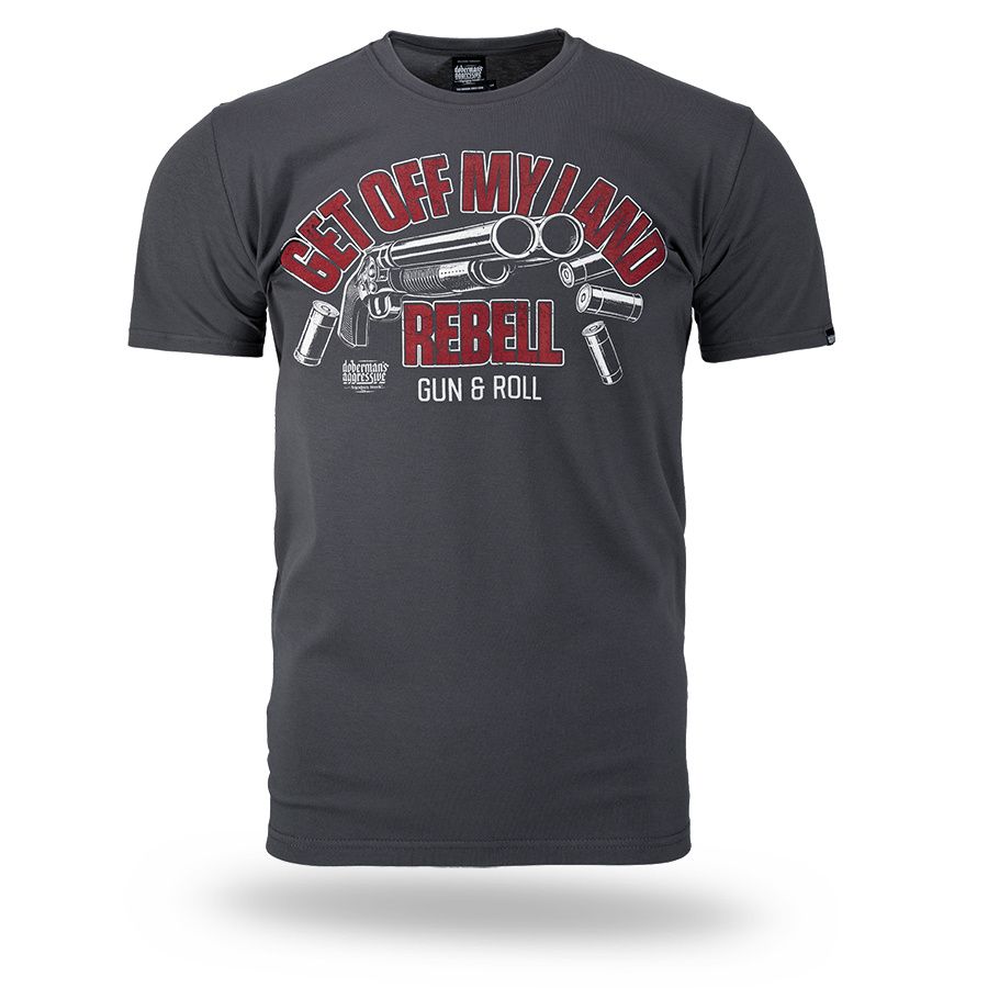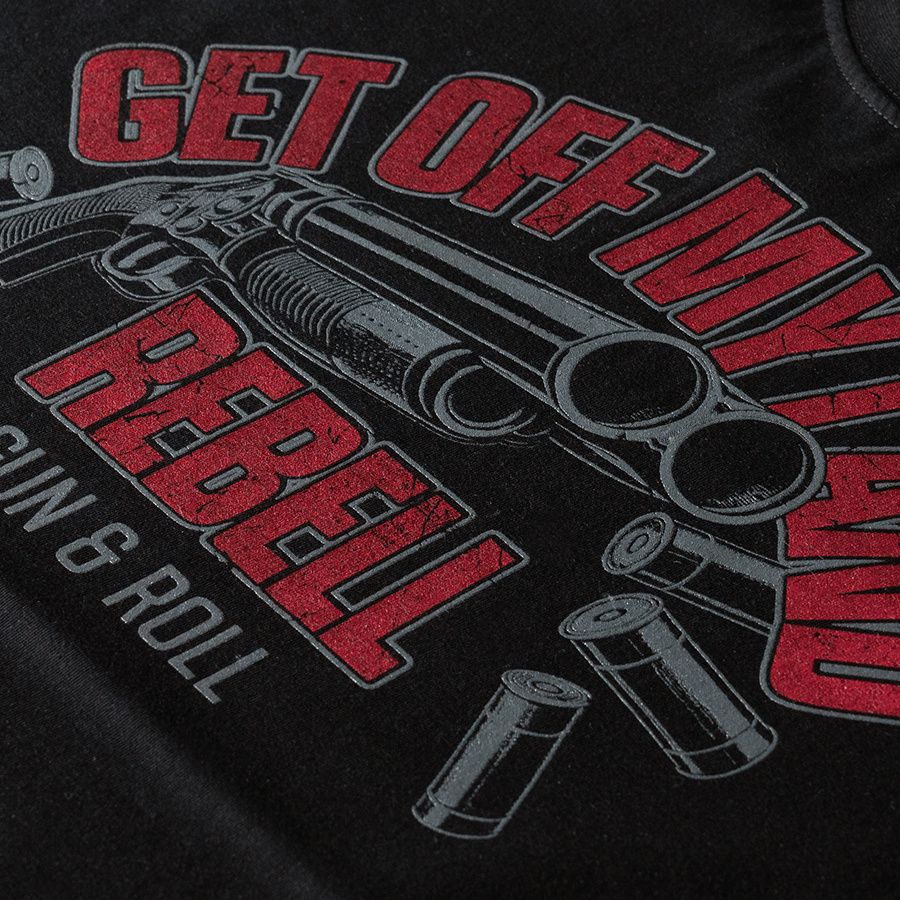 Pánske tričko zo 100% bavlny klasického strihu s krátkym rukávom. Na ľavom rukáve je umiestnená malá ceduľka s logom značky. Na hrudníku veľká potlač Get Off My Land REBELL Gun & Roll.