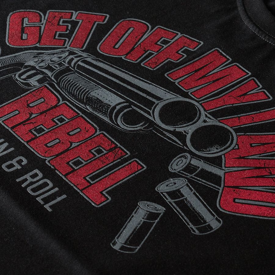 Pánske tričko klasického strihu s dlhým rukávom zo 100% bavlny.Na ľavom rukáve je malá ceduľka s logom Doberman's Aggressive. Na hrudníku veľká potlač Get Off My Land REBELL Gun & Roll.