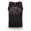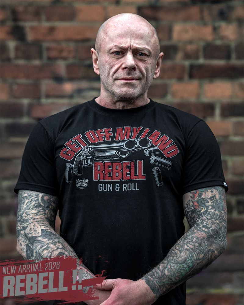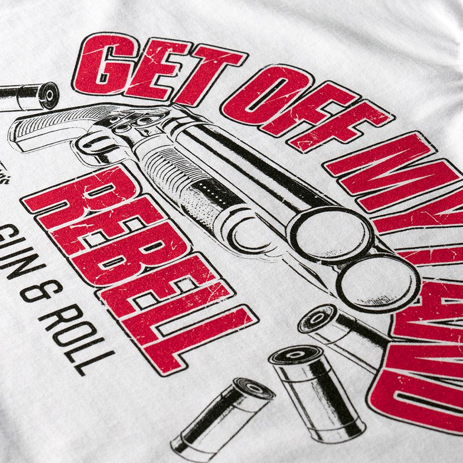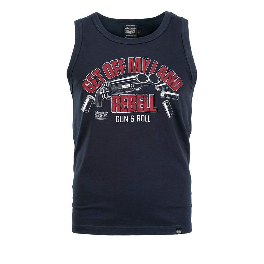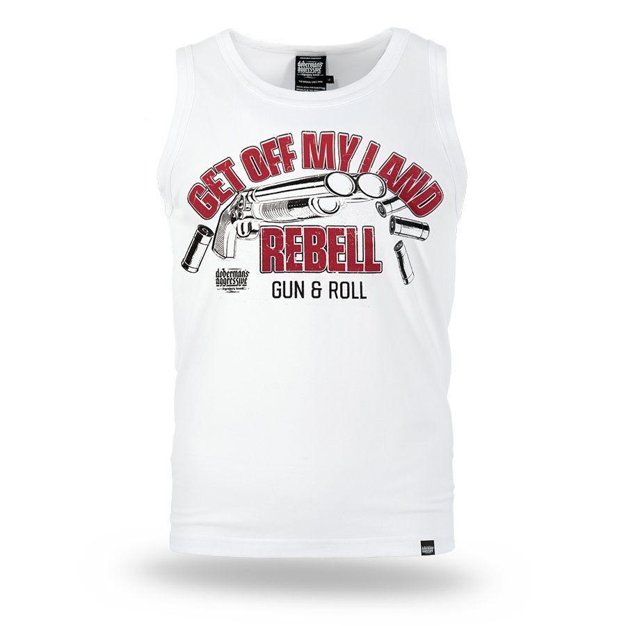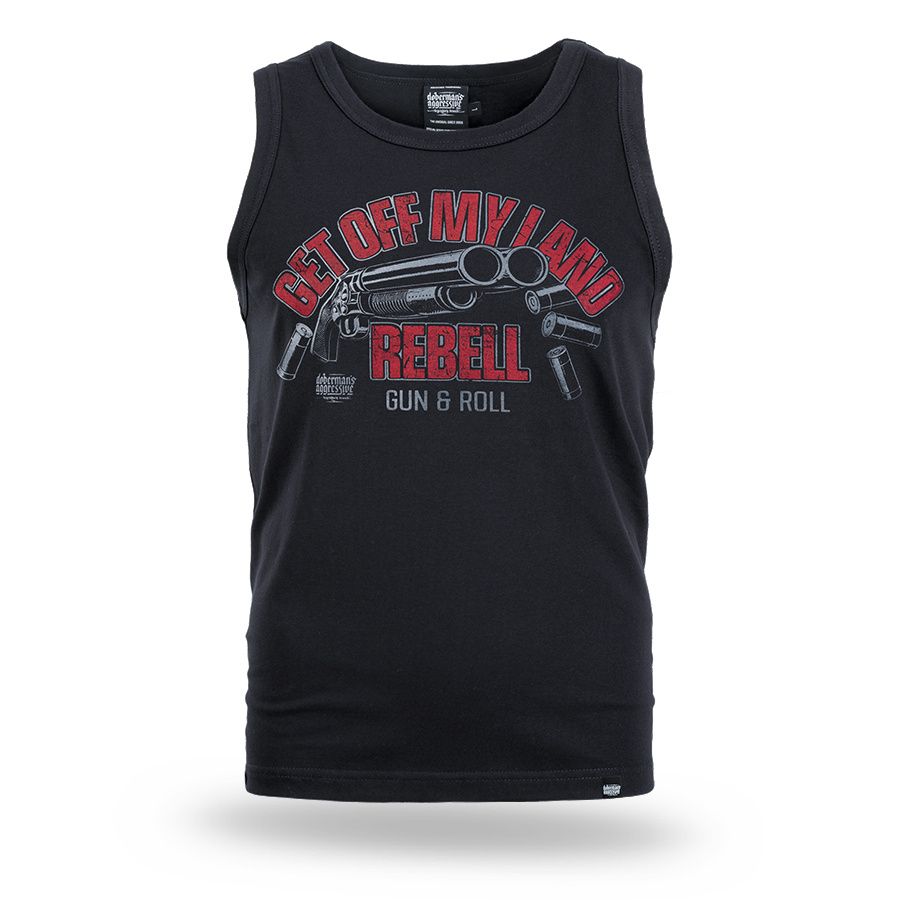Pánsky nátelník. Na prednej strane je veľká potlač s nápisom Get Off My Land REBELL Gun & Roll.