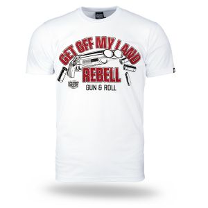 Pánske tričko zo 100% bavlny klasického strihu s krátkym rukávom. Na ľavom rukáve je umiestnená malá ceduľka s logom značky. Na hrudníku veľká potlač Get Off My Land REBELL Gun & Roll.