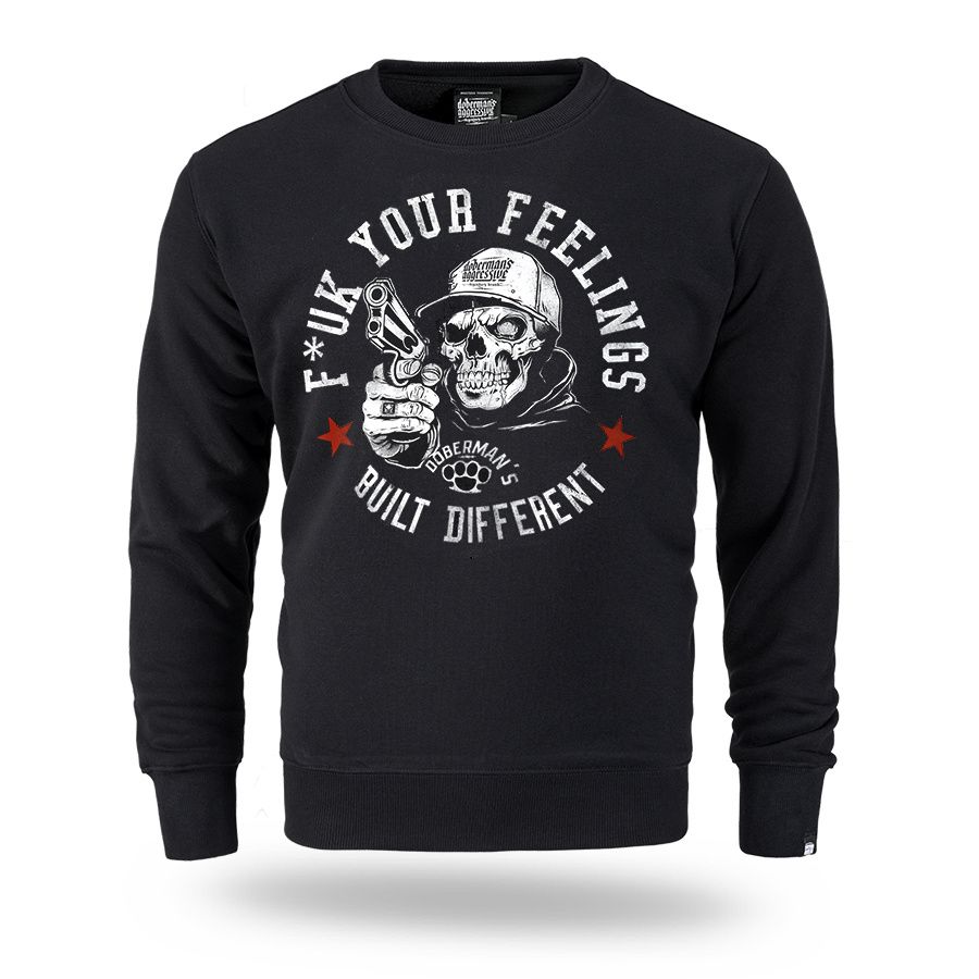 Klasická pánska mikina. Na ľavom rukáve je malá ceduľka s logom značky. Dolná časť mikiny a rukáve sú zakončená širokým sťahovacím lemom. Na hrudníku veľká potlač F*ck Your Feelings – Built Different.