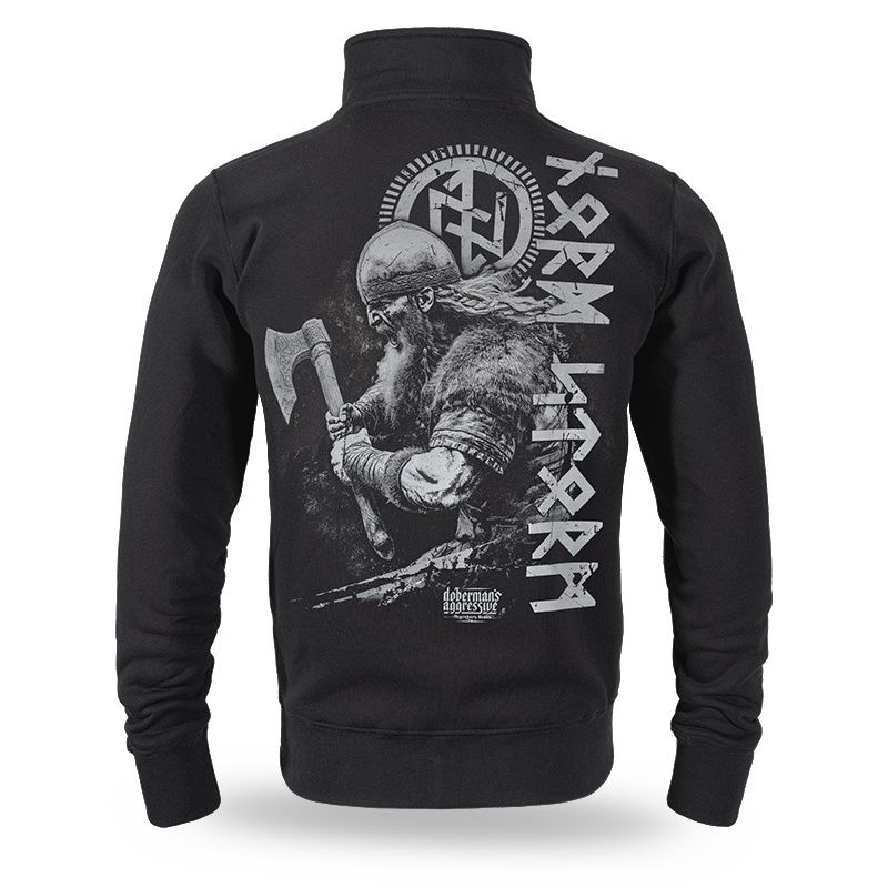 Mikina na zips so sťahovacími lemami s dvoma vreckami na prednej strane zo 100% bavlny. Na zadnej strane je veľká potlač bojovníka so sekerou a runovými symbolmi. Na prednej strane minimalistický potlač Storm.