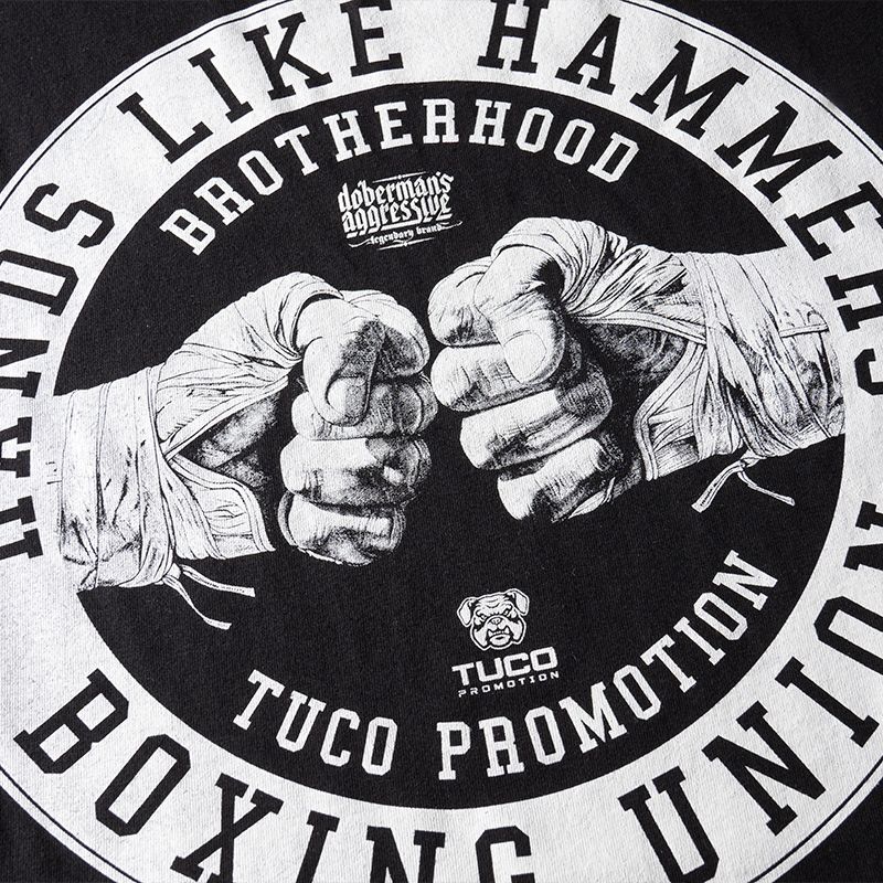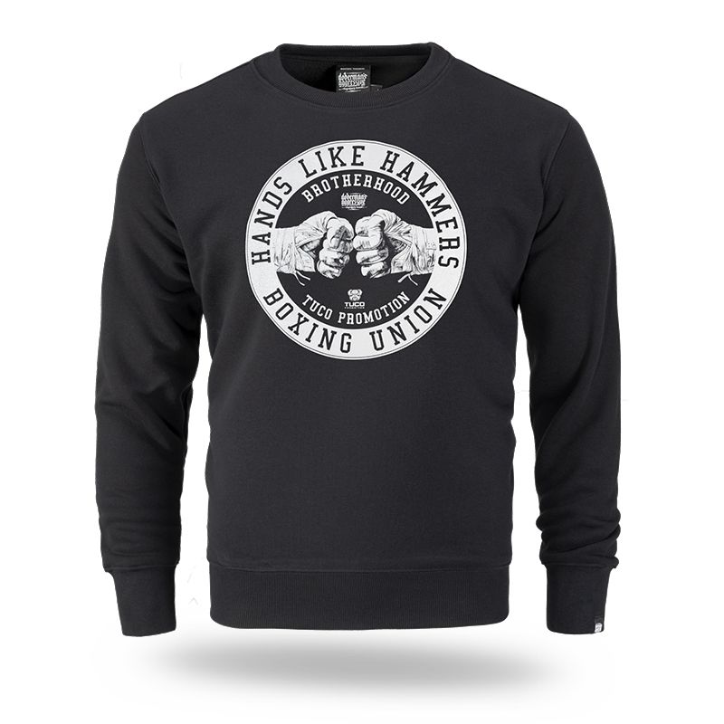Klasická pánska mikina. Na ľavom rukáve je malá ceduľka s logom značky. Dolná časť mikiny a rukáve sú zakončená širokým sťahovacím lemom. Na hrudníku veľká potlač Hands like hammer, boxing union.
